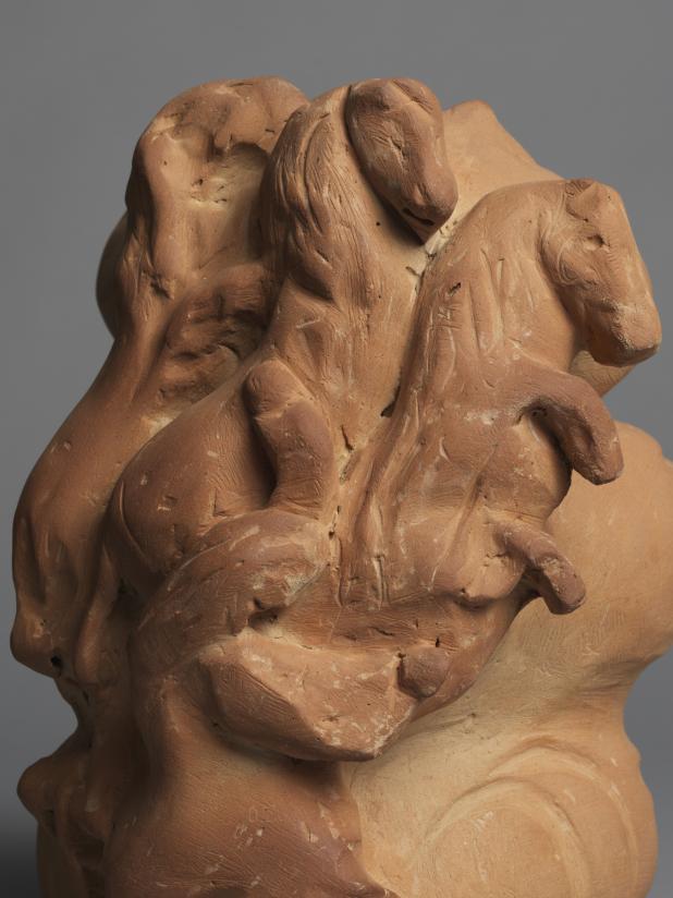 Franz Meyer called Chagall’s ceramics “physical volumes that led the painter to sculpture in the strict sense of the term.”2 Devoid of decoration and polychrome, the first version was almost certainly a terracotta proof. While the utilitarian aspect is still perceptible in the other variant, here the treatment of the raw clay by adding material and modeling might suggest a high-relief sculpture.