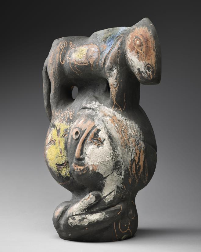 The shape, reproduced using a mold, is common to all four works. Only two cavities attest to the piece’s utilitarian aspect. The foot of the vase features two breasts and a hand, while the belly has two heads topped by a neck shaped like an animal—probably a horse or a donkey, iconographic motifs recurrent in the artist's work. A hand, symbolizing the creative gesture, and a beast are also present on the Sculpted Vase [Vase sculpté] (1952). Here, the protective animal overhangs the rounded shape of the two heads,2 rising like a hill.