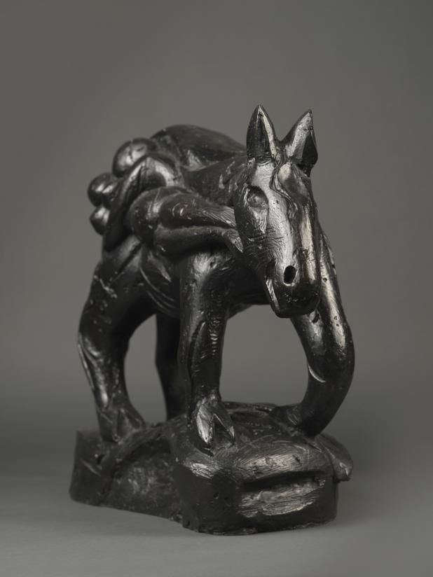 Two copies of The Fantastic Beast were cast in bronze from a sculpture made of plaster on metal framework. This is Chagall’s most frequently exhibited sculpture. The bronze castings were made using the lost wax technique. The wax model of the sculpture, made from the plaster version, was surrounded in a mold made of refractory earth or cement. This both enveloped the outside and filled the inside. Molten metal then chased out the wax, which liquefied under the heat and ran out the sprus and gates placed on the wax model prior to casting, for the purpose of letting wax and air out. Lastly, the bronze copy was devested—freed from its mold—and then cleaned of remaining shell material, polished, and perhaps covered in a patina.