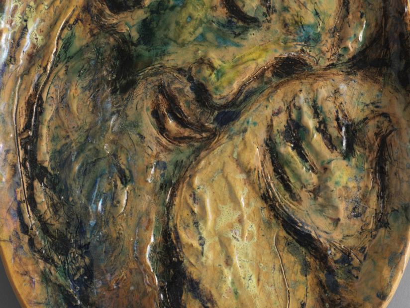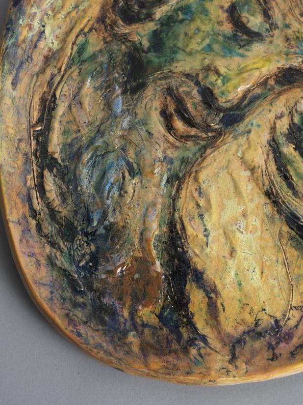 The iconography of this piece is different from traditional depictions of Jacob's dream, also known as "Jacob's ladder". The angels moving up and down the ladder in the dream are absent here. Only the stone that the patriarch put under his head before falling asleep at dusk on his way to Haran recalls the passage from the Book of Genesis. Jacob’s head, his eyes shut, takes up the entire space of the piece like a close-up shot in a movie, conferring an unprecedented modernity on the Biblical character and creating a close bond between him and the viewer. It is not so much the narrative as the dream’s mystery and intensity in its intimate, prophetic dimension that Chagall seems to want to share with the viewer. The spare composition remarkably suits the vibrancy of the material, from which Jacob struggles to break free in a movement out towards the world, almost enveloping the viewer. His face, beard, hands and the stone are in relief, with a barbotine decoration. Oxides in shades of brown, ochre, yellow and green, a host of nuances, evoke the arid desert soil in contact with the cool night air. Jacob's face recalls some of Rembrandt's portraits of old men, which Chagall revered and from which he drew inspiration, especially for his Biblical subjects. The treatment of the material, the movement of the relief and the shimmering colors may also echo Mikhail Vroubel's late 19th and early 20th century glazed majolica pieces, which sparked Western painters’ interest in ceramic art.