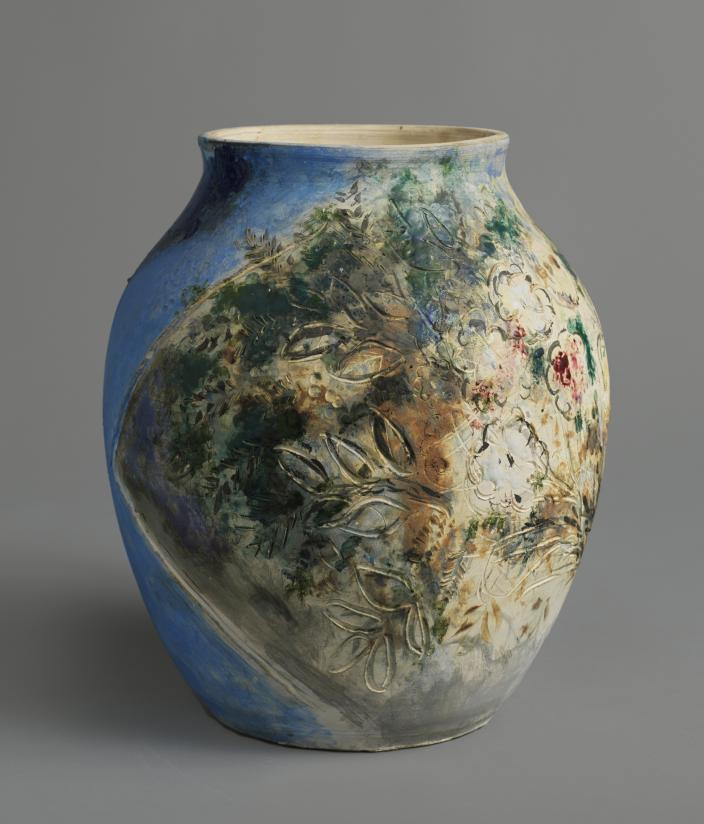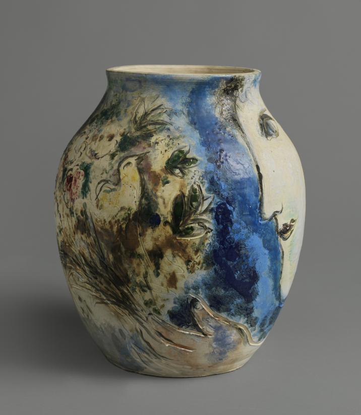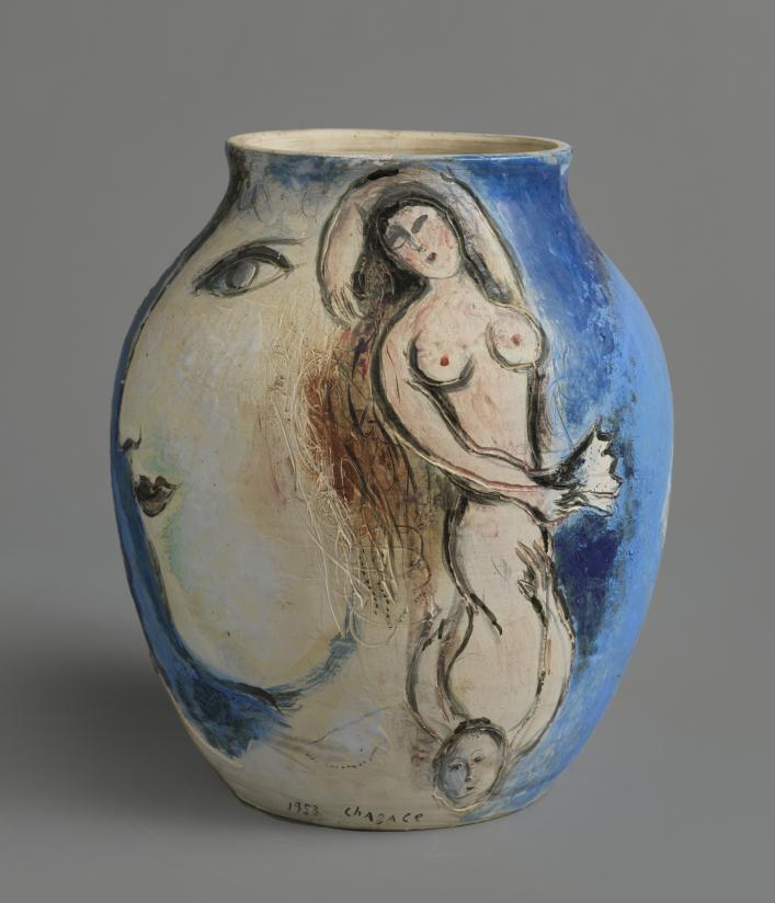 Marc CHAGALL, Profile and Nude or Paradise Blue Vase (Profil et nu ou Vase bleu paradis), 1953, white clay, decorated with slips and oxides, engraved with a knife and dry point needle, 10 1/4 in. (26 cm), Private collection © Fabrice GOUSSET/ADAGP, Paris, 2025
