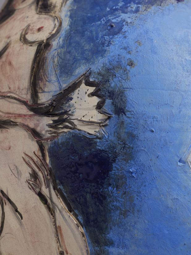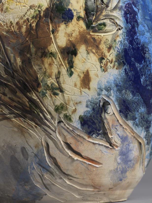 Marc CHAGALL, Profile and Nude or Paradise Blue Vase (Profil et nu ou Vase bleu paradis), 1953, white clay, decorated with slips and oxides, engraved with a knife and dry point needle, 10 1/4 in. (26 cm), Private collection © Fabrice GOUSSET, Fabrice Gousset/ADAGP, Paris, 2025