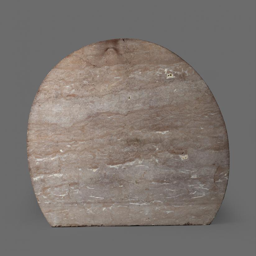 The stonework, playing on the sinuosity of engraved, incised, and chiseled lines, reveals dancing, sensual arabesque forms in keeping with the circular shape of the stones and the carnal theme. The color of the stone, similar to wine lees and evoking the porphyry red used since Antiquity, is adorned with lacy white flecks lending an imperial, monolithic force to the whole. A far cry from the conventional portrayal of the low relief David and Bathsheba [David et Bethsabée] (1982 - 1983), the monumentality of the bodies, treated in full, round volumes, contrasts here with the landscape in the background, more schematic and acerate. This graphic piece evokes the lithographs created for the Bible and published by Verve (1960), including those devoted to Ruth and Booz. The same search for circularity is apparent there, and is equally present in the beach stones painted by the artist in the same period, as well as beforehand in the principles of composition of the paintings and of the grand, monumental décor.