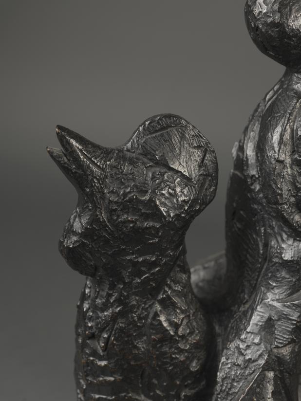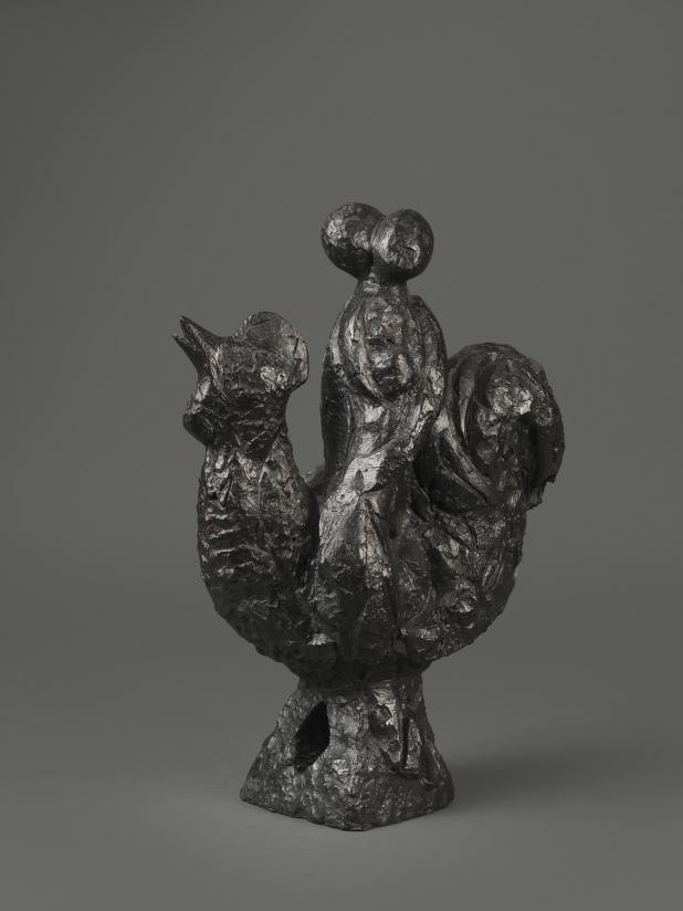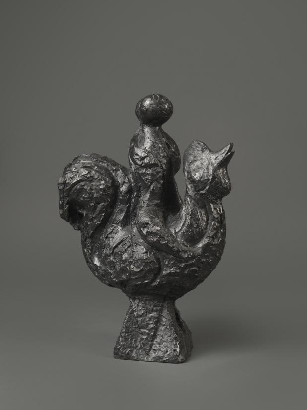Due to its symmetrical composition, featuring a stable base, and to its decorative appearance, The Rooster evokes the ceramic works of central Russian potters, as well as, among others, ceramics from the city of Skopine, in the Ryazan region, and ceramics from Gjel, near Moscow. This design and the same composition were often used to make recipients for cold drinks. The shape of the sculpture, almost rustic with its irregularities and plays of light, doesn’t fail to echo the sculptures and figurines made by Russian artisans using wood shears. It was no accident that Ossip Zadkine, who hailed from the same city as Chagall, appropriated the technique in 1943 for his patina bronze sculpture. Present in many cultures, the rooster is a totemic animal in Russia, where it is associated with the sun, fire, and protective strength. The pair of lovers in an embrace, straddling the rooster, is a recurring theme throughout Chagall’s body of work. Namely, it is found in the celebrated painting on canvas entitled Fiancés of the Eiffel Tower or Bride and Groom With Eiffel Tower [Les Fiancés de la Tour Eiffel ou Les Mariés de la tour Eiffel] (1936 - 1939), in which the gallinaceous bird seems to link the upheavals of the past to a future filled with hope.