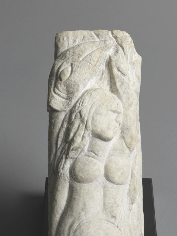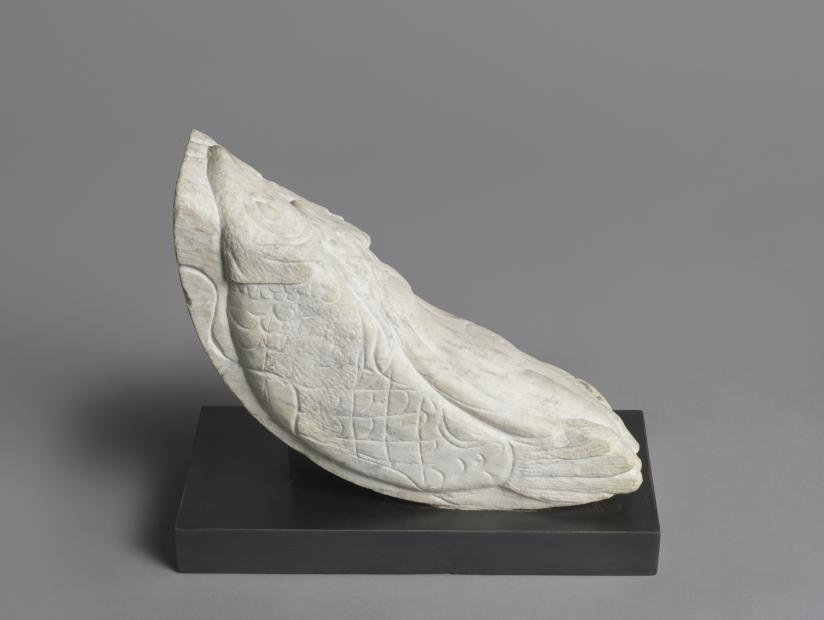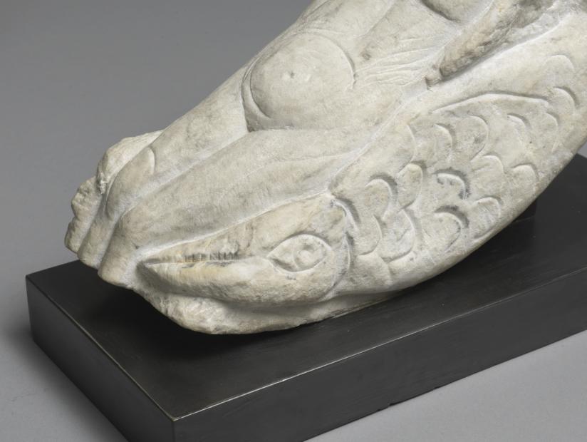The half-moon stone carving hugs the contours of the fish and the female body, creating a dynamic of equilibrium, held in balance by the black marble base. The highly understated surface treatment of the stone alternates between polished and coarser surfaces, on which burin marks are still visible. The aesthetic approach of working with the material and its natural appearance, the vision of a singular primitivism, brings the original shapes of prehistoric Venus figures back to the forefront. The rendering of volumes and the key position accorded to the circular form (face, breasts, abdomen), as well as the voluntarily archaic appearance of the fish (scales, fin), also evoke Romanesque art and, more specifically, the sculpted chapiters of churches and cathedrals, including those of Autun, which Chagall discovered on a journey to various regions of France between 1925 and 1928.