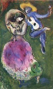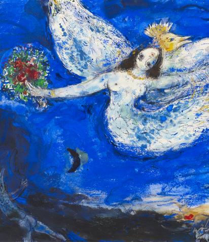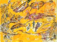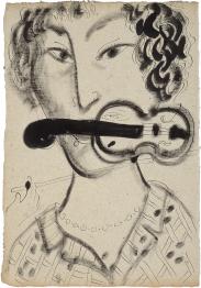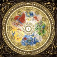 The vital relationship that Marc Chagall cultivated with music was rooted in the Hasidic culture of his childhood, in religious singing and Russian popular music. His first years were steeped in song and prayer, which he heard at the synagogue: “I will be a singer, a cantor. I will train at the Conservatory. I signed on as an assistant to the cantor, and on feast days, the entire synagogue and myself would distinctly hear my soprano voice floating in the air.” Violinists, players of the bandura or shofar (a ram’s horn used in formal ceremonies at the synagogue), and street musicians are sprinkled throughout the artist’s works starting in the 1910s. Beyond these identifiable images, Chagall was also interested in the notion of rhythm and musical sequence, which he distilled in his compositions between 1914 and 1920. Namely, he used India ink and a rhythmic and calligraphic writing style, searching for musicality within his compositions themselves. In 1919, he began working on a stage set commission for Moscow’s Jewish Art Theater (GOSET), at the instigation of its director, Alexeï Granovski. He designed a universal decorative program on the topic of arts and music, composed of seven main panels. As an artistic manifesto, this ensemble helped assert Yiddish culture in Eastern Europe by spotlighting popular theater and placing it in an artistic, vibrant modernity on par with the avant-garde. During his exile in the United States, Chagall renewed his interest in designing stage sets. In 1942, he worked with Bella on the stage sets and costumes for the ballet Aleko, based on a poem by Alexander Pushkin, The Gypsies, and set to music by Piotr Ilitch Tchaikovsky. In 1945, Chagall continued his stage design work in New York for Igor Stravinsky’s ballet Firebird, drawing inspiration from both Mexican and Russian sources. In 1958, back in France, he set to work on sets for the ballet Daphnis and Chloe, based on the pastoral by Longus and set to music composed by Maurice Ravel, bringing to life a bucolic Greece. The 1960s saw the beginning of a new stage in the artist’s career, as he confronted monumental art. The bold, brilliant ceiling of the Paris opera house, commissioned to Chagall by André Malraux in 1962, pays tribute to fourteen composers and their works through a décor covering more than 220 square meters (over 2360 square feet). Chagall’s exploration of color ranges and new materials deepens the perception of musicality in his own work, unveiling a constant search for rhythms, vibrations, and tones through which the art “becomes a sound.”