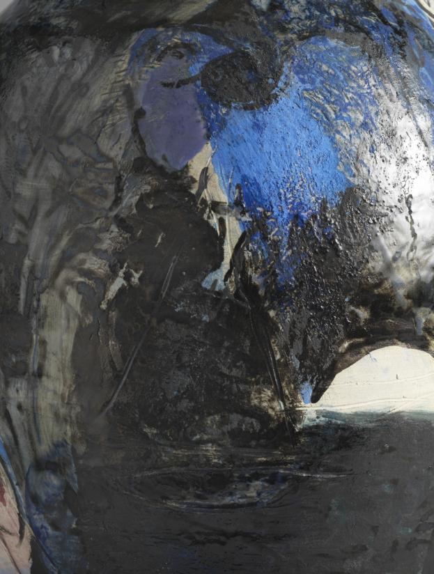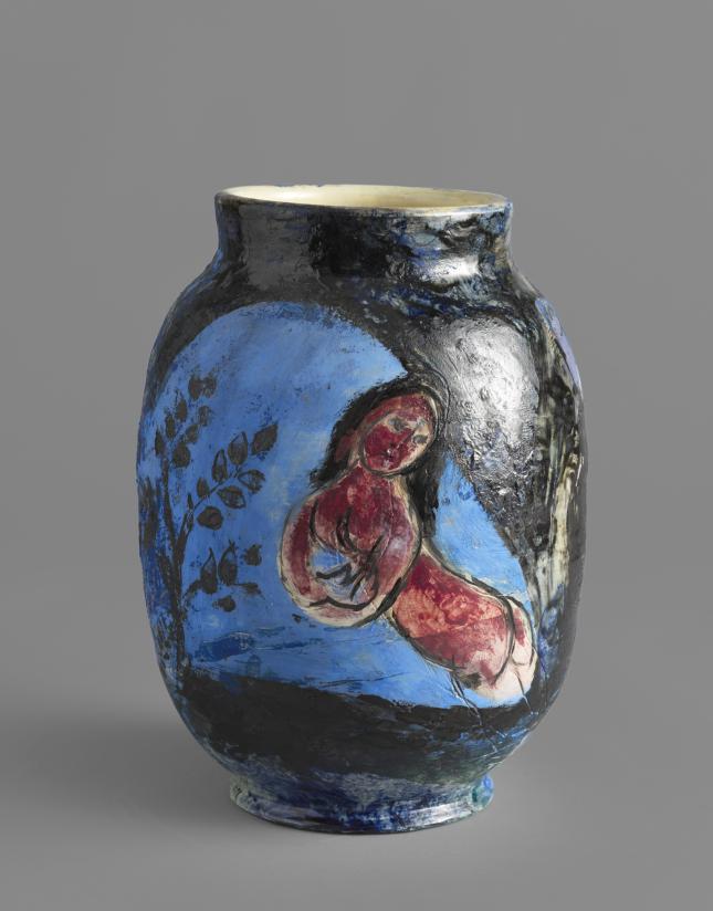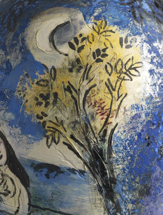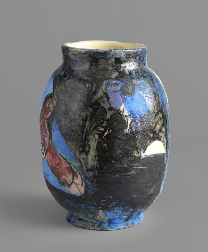 Le Songe (1952) fait partie des premiers vases réalisés par Marc Chagall à partir de 1951. Si la forme utilitaire de la pièce conserve une certaine sobriété, la matière riche et picturale du décor est obtenue grâce aux ajouts successifs d’engobes et d’oxydes et à l’enlèvement de matière par une technique héritée du sgraffito1 rappelant la gravure. Vase « à la panse ovoïde » et à « l’ouverture large » – sûrement exécuté à l’atelier Madoura2 et reflétant des préoccupations formelles visibles également dans Grand visage et oiseau (1952) et Profil et nu ou Vase bleu paradis (1953) –, il appelle, d’après Sylvie Forestier, à « un développement historié sur le pourtour 3 ».