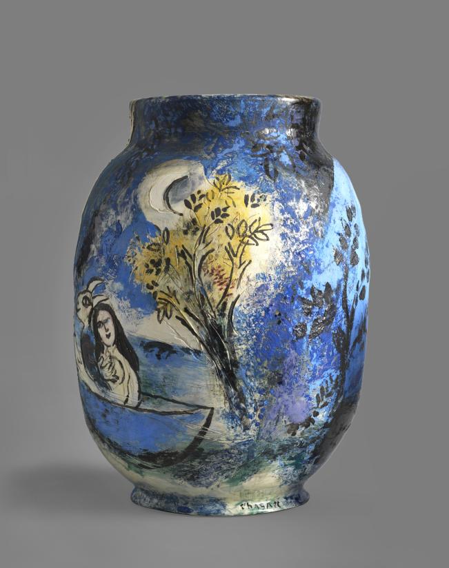 La couleur bleue intense, révélée après la cuisson, est utilisée pour représenter le paysage méditerranéen que Chagall découvre lors d’un voyage sur la Côte d’Azur en 19264 puis retrouve à l’occasion de son installation dans la région en 1949, après la tragédie de la Seconde Guerre mondiale. Un poisson monumental se dresse jusqu’au col du vase. Animal du bestiaire chagallien et symbole judéo-chrétien, il est représenté par l’artiste à travers diverses techniques dont la céramique (Le Poisson (1952) ou Nature morte au poisson (1952)) et la sculpture (Femme au poisson (1952)). Ce dernier surplombe une femme et un homme à la tête d’animal – voguant sur une barque – figurant probablement Titania et Bottom, comme le suggère le titre de cette céramique évoquant Le Songe d’une nuit d’été de Shakespeare dont l’action se déroule en Grèce. Le thème, traité tour à tour par l’artiste à travers la peinture (Le Songe d'une nuit d'été (1939)) et la céramique (Le Songe d'une nuit d'été (1952)), illustre le goût de Chagall pour les arts de la scène. Cet intérêt traverse son œuvre depuis ses premiers décors et costumes scéniques conçus à Moscou dès 19195, tels que l’un des quatre panneaux pour l’auditorium du Théâtre d’art juif (GOSEKT) : Théâtre d'art juif, Moscou : panneau pour Le Théâtre (1920).