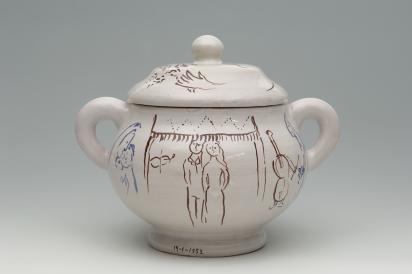 Marc Chagall crée en 1952, pour le mariage de sa fille Ida avec Franz Meyer1 le 19 janvier 1952, un service de mariage unique à l’atelier Madoura à Vallauris. Composé de 77 pièces2 et dédié « Pour Ida de son papa », ce service s’inspire des formes traditionnelles de vaisselle dite provençale, parmi lesquelles plat, soupière, ravier, assiettes, bols, tasses, soucoupes. Sur une terre épaisse émaillée de blanc monochrome se dessinent de légers et graphiques décors bleu cobalt et terre de Sienne brûlée. Aux formes simples et élégantes des pièces du service répondent les décors vibrants, esquissés, presque calligraphiés peints par Marc Chagall. Loin des effets décoratifs de la céramique bleue et blanche chinoise3, les décors apposés par l’artiste semblent spontanés, laissant libre cours à l’imaginaire et à la fluidité du mouvement. Des scènes circassiennes (Service de mariage d’Ida Chagall : sous-tasse 9 : Ecuyère à la tour Eiffel (1951)), des amoureux tendres (Service de mariage d’Ida Chagall : sous-tasse 4 : Amoureux au clair de lune (1951)), des animaux hybrides aux réminiscences populaires russes (Service de mariage d’Ida Chagall : saladier : Nu au bouc-poisson (1951)) et des scènes décalées, parfois cocasses, à l’humour vif (Service de mariage d’Ida Chagall : ravier 1 : Amoureux à l'éventail (1951)) ; (Service de mariage d’Ida Chagall : sous-tasse 10 : Le regard dans les fleurs (1951)), composent le décor du service. Très proche des œuvres graphiques du début des années 1950, le style des décors surprend par sa liberté et sa rapidité, l’artiste le souhaitant inscrit dans un instantané, une célébration de la vie. Les convives du mariage sont invités à déguster des plats dans des contenants aux décors surprenants, dont la vision et la réception les invitent à entrer dans un univers facétieux et tendre, qui modifie l’expérience gustative et fait prendre aux papilles un autre chemin. Harmonieux et subtil hommage à Ida Chagall4, le service de mariage est un rare exemple de céramique utilitaire créée par Marc Chagall ayant réellement servi au cours de la réception du mariage et à d’autres réceptions.