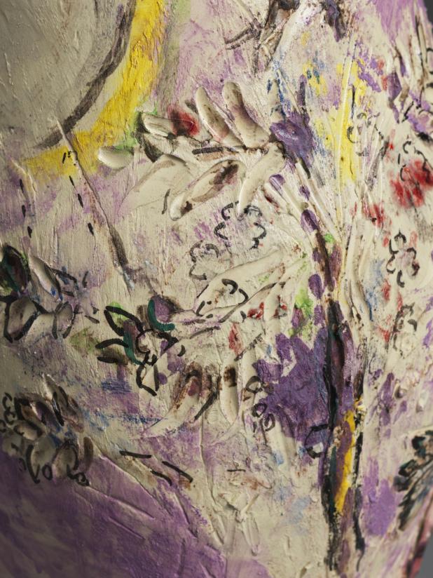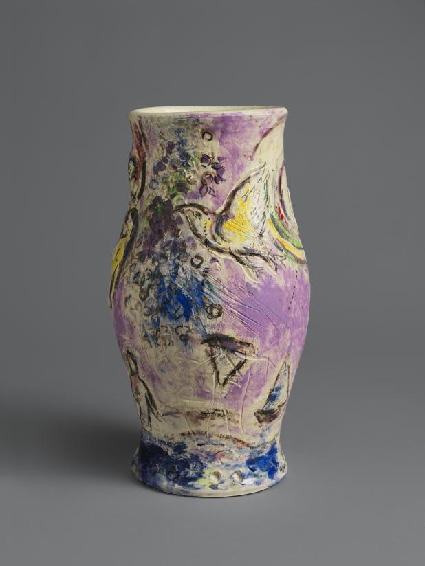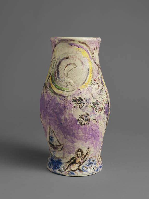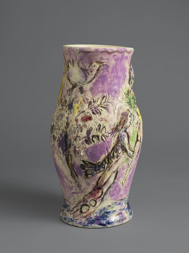 Marc CHAGALL, Vase mauve, 1962, terre blanche, décor aux engobes et oxydes, gravé au couteau et à la pointe sèche, émail partiel au pinceau, sous couverte, 43,2 x 23 cm, Collection particulière © Fabrice GOUSSET/ADAGP, Paris, 2025