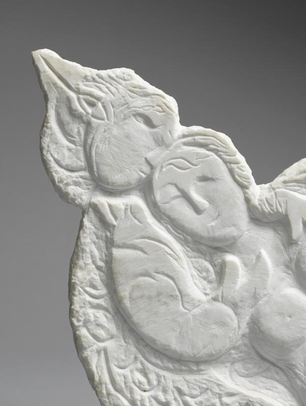 La découpe brute de la pierre, suivant les contours du couple et du bec de l’oiseau, joue sur les contrastes formels pour créer une œuvre à double lecture, dans laquelle le couple et l’oiseau fusionnent. La juxtaposition et le découpage des éléments livrent la richesse des inspirations de l’artiste, évoquant tour à tour la structure des loubki, images populaires russes, au sein desquelles l’iconographie du coq se déploie depuis le XVIIe siècle, et les bas-reliefs aux motifs décoratifs ciselés des temples khmers1, guirlandes, crosses et feuillage. À l’écoute des matériaux, Marc Chagall l’est aussi des cultures, ne cherchant jamais à imiter mais « à écouter attentivement les messages de ces peuples et de [leurs] arts2». La pureté du marbre blanc est associée à un travail d’incisions de profondeurs variées, qui rythment la surface de la pierre. Les corps, traités de manière sobre et sans effets décoratifs, contrastent avec le plumage du coq, couvert d’arabesques et de motifs circulaires. Accentuant le tracé graphique des lignes, ces motifs ornementaux font écho à la végétation luxuriante présente sur les manuscrits enluminés et les stèles funéraires juives des XVIIIe et XIXe siècles, visibles également sur les bas-reliefs Âne, poisson, lune et deux oiseaux ou La Colline (circa 1966) et Deux oiseaux et un lapin ou La Colline (circa 1966).