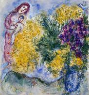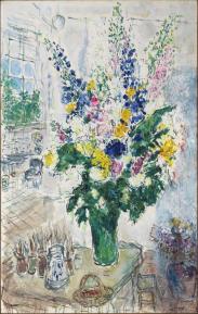 Au retour de Chagall en France, en 1923, les fleurs se déploient à foison dans l’espace du tableau. Représentées souvent dans un environnement extérieur, elles forment comme un « lien entre le peintre et un paysage nouveau », devenant un moyen d’enracinement de l’artiste en quête d’une nouvelle identité dans son pays d’adoption. L’immersion dans des paysages naturels au cours de multiples voyages en France mais aussi la révélation de couleurs nouvelles s’accomplissent à travers l’étude des fleurs : « L’abondance et la variété des fleurs m’émerveillaient et me fascinaient. […] Cette profusion de fleurs avait contribué pour beaucoup à développer la palette des meilleurs artistes français. » Pour Chagall, reconnu de son vivant en sa qualité de grand coloriste, ce sont les peintres français, notamment les impressionnistes, qui ont su faire le meilleur usage du « pigment floral » et opérer ainsi une « chimie » si chère à l’artiste, à savoir, insuffler la vie à la couleur.
